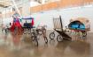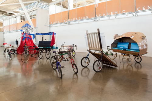 Over the past semester Cruzvillegas and students in the Graduate Program in Fine Arts have been investigating concepts of need and scarcity in relation to object making. Their starting point was the customization and transformation of found materials into bicycles and other functional vehicles. Discussing the forms the vehicles might take, options ranged from a delirious machine to a popcorn vehicle, an art-making trailer, a happy machine, a mirror-reflecting vehicle, a festival-on-the-go machine, a mobile sound system, a half-man half-vehicle, a music vehicle, an elements wagon, a bike raft, and a bird surrey. The themes inspiring these forms included memories, community, imagination, motion, happiness, celebration, environment, work, speed, energy, and fun. The students also aimed to address issues specific to the Bay Area such as pollution, community, economics, and politics. They visited numerous scrap yards, then collected and recycled parts from old bikes with other found objects and junk to create three vehicles, which will be presented in the nave and paraded in front of CCA's SF campus.